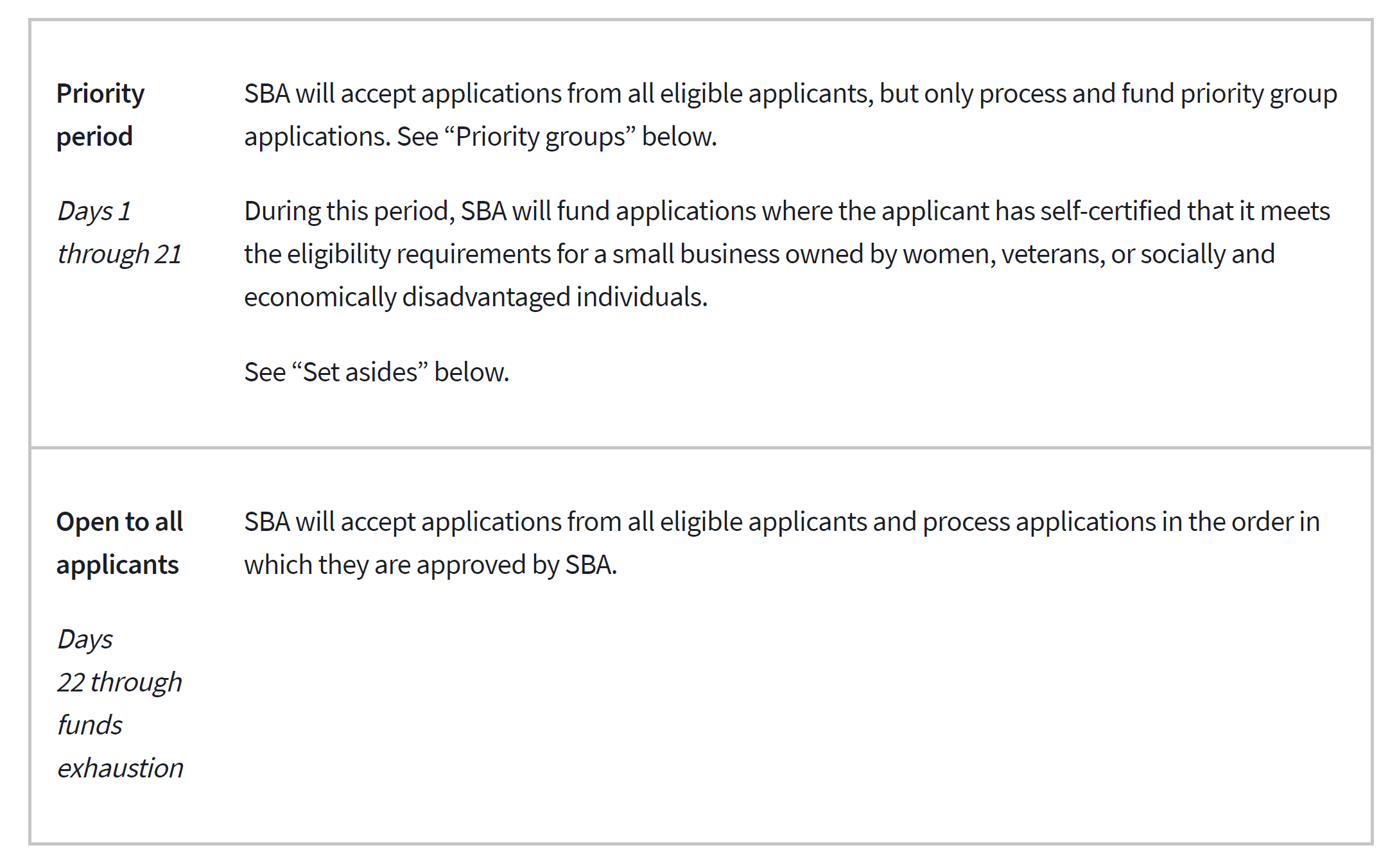 Unfortunately, if you happen to be a white male business owner, you will not be eligible for the “priority period” processing and funding.